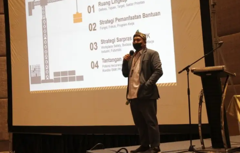 Materi mengenai Panduan Perencanaan Pelaksanaan dan Pengawasan Pembangunan disampaikan oleh Muhammad Subhan selaku Konsultan Pembangunan Bidang Sarana Prasarana Direktorat SMK memberikan informasi terkait konstruksi sekolah masa depan mengikuti standar internasional yang dapat diadopsi oleh SMK Indonesia.
