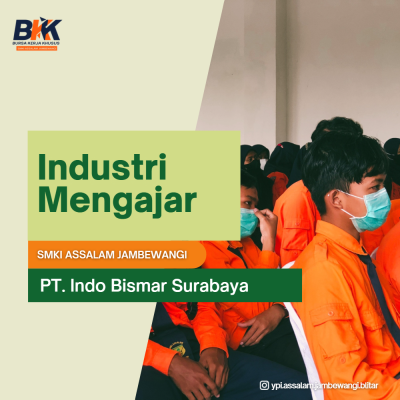 SMK Bisa!! SMK Hebat!! Bergema memenuhi ruangan dalam pembukaan acara seminar “Industri Mengajar” 18 Januari 2022. Acara yang di selenggarakan oleh BKK (Bursa Kerja Khusus) SMKI Assalam Jambewangi Blitar menghadirkan orang-orang terhebat dari PT.Indo Bismar Surabaya. Tujuan dalam acara ini yaitu dapat menjalin kerja sama dengan perusahan luar dan meningkatkan semangat siswa dalam belajar menghadapi era industri saat ini.