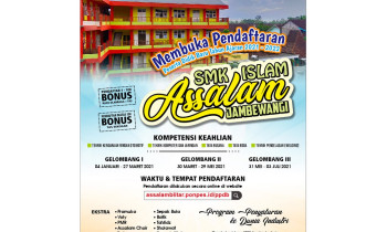Sekolah Menengah Kejuruan (SMK) Islam Assalam Jambewangi membuka pendaftaran peserta didik baru Tahun Pelajaran 2021/2022Kompetensi Keahlian:- Teknik Kendaraan Ringan Otomotif- Teknik Komputer & Jaringan- Tata Busana- Tata Boga- Teknik Pengelasan (Welding)Jadwal PendaftaranGelombang I : 04 Januari - 27 Maret 2021Gelombang II...