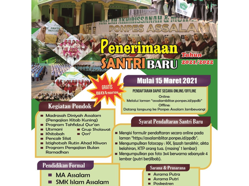 Pondok Pesantren Putra & Putri Assalam Jambewangi membuka pendaftaran santri baru Tahun 2021/2022Kegiatan Pondok:1. Madrasah Diniyah Assalam (Pengajian Kitab Kuning)2. Program Tahfidzul Qur'an3. Utsmani4. Khitobah5. Pencak Silat6. Isthighotsah Rutin Ahad Kliwon7. Program Pengajian Bulan RamadhanPendidikan Formal:1. MA Assalam2. SMK Islam...