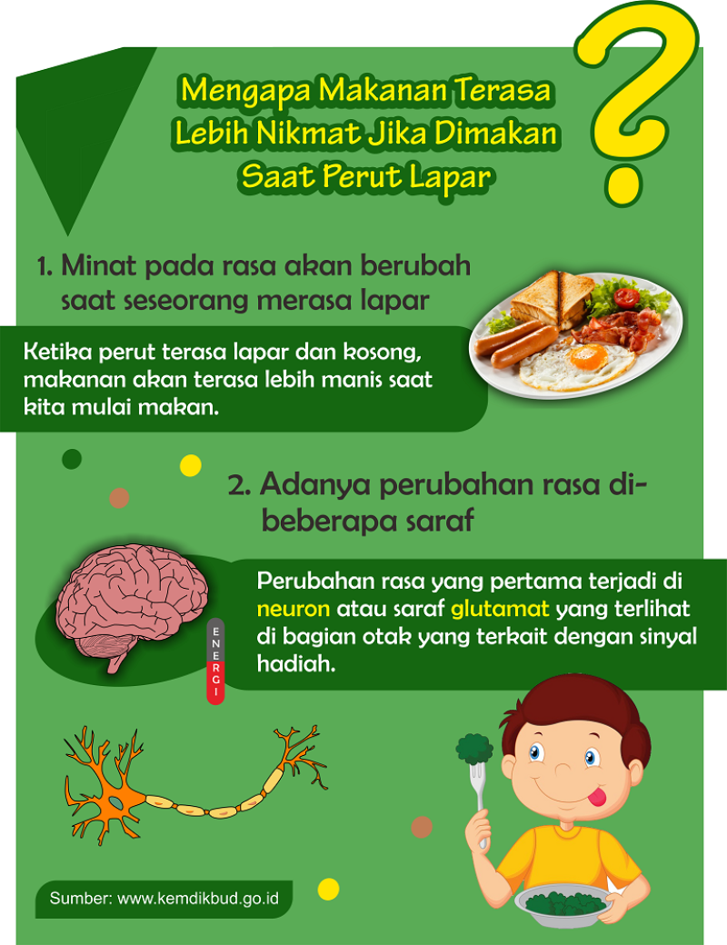 Pernahkah teman-teman semua merasa makanan terasa lebih nikmat ketika dimakan saat lapar? Apa ya sebabnya? Cari tahu jawabannya yuk, pada gambar di atas!
